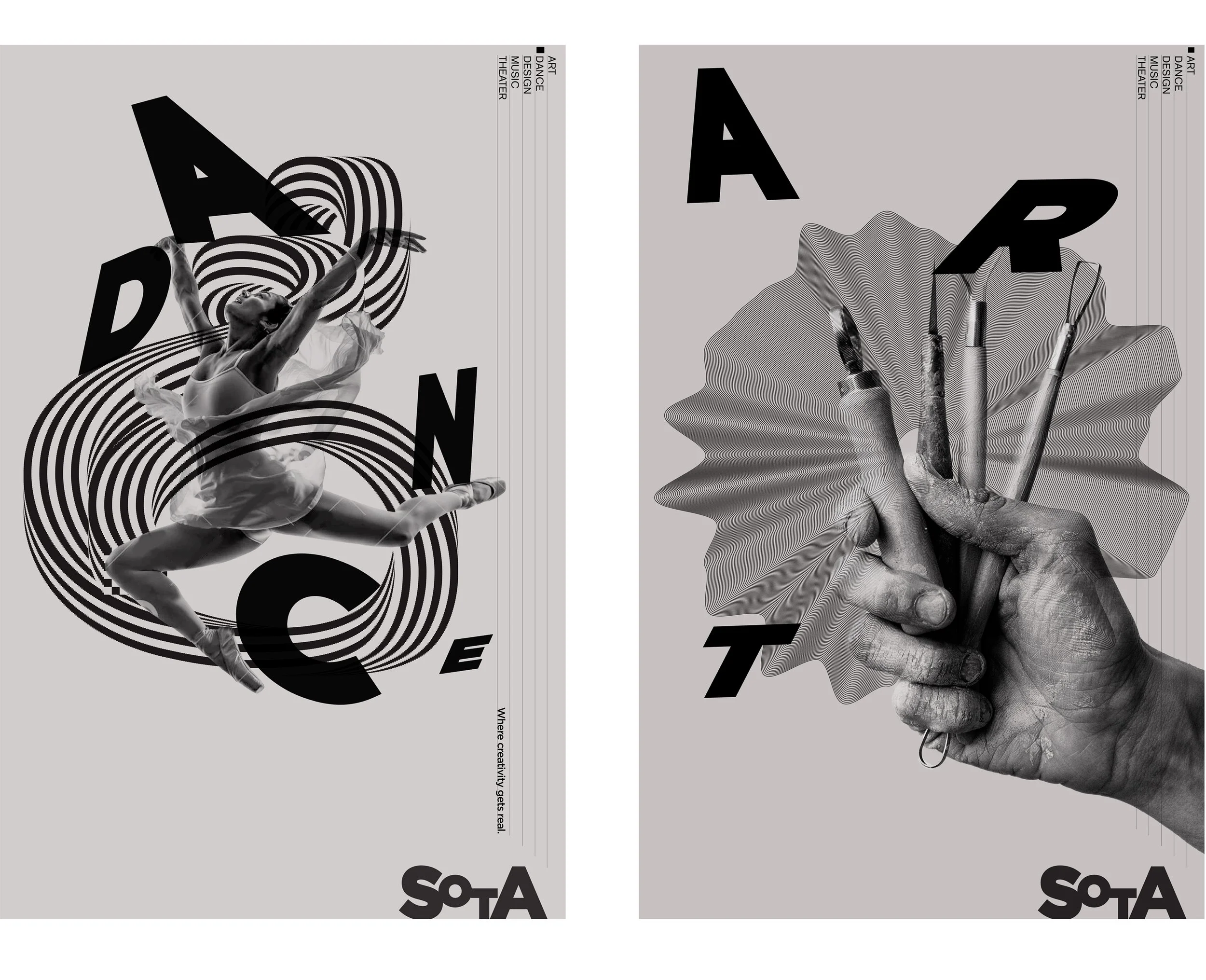 The new platform focuses on the personalized, hands-on, and professionally-driven education one receives at SOTA; a unique experience in the region. It highlights how learning and nurturing creativity can solve real world problems when the world is looking for answers. Using energy, whimsy, and formal qualities, I created a series of explorations. SOTA is a school where experiments and pragmatism collide, resulting in creative individuals ready to work in the real world. At SOTA you “live it to learn it.” With a punchy post-covid color celebration, bright eclectic attitude, and a framework connecting music, theater, dance, art, and design into one vibrant playground, the identity shows a way forward in an institution in need of new thinking.