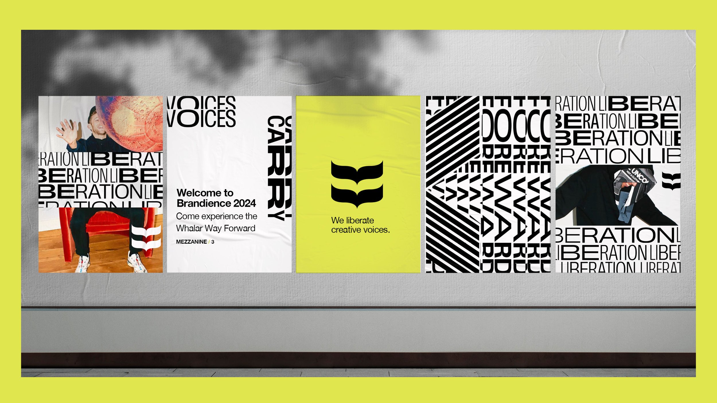 Inspired by the spirit of the post modern media canvases like MTV, and 1970s Xerox’d punk flyers on New York City telephone poles, creating a digital first language for a pioneering creator’s platform had to be rooted in originality. A key visual element is a step and repeat pattern, creating an amplification technique where graphics feel as if they are growing exponentially, like voices. This fluidity is supported with a typographic approach where a variable type , typeface, supports the scaling of typographic arms, crossbars and ascenders, that mimic conversations, emblematic of Whalar’s relationships to brands and creators. A brutally honest flash photography style was proposed that puts the spotlight on people. This toolkit of elements contributes to the idea of freedom, a creative playground and emulates how individual expression can help amplify the biggest brands in the world.